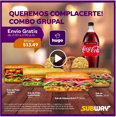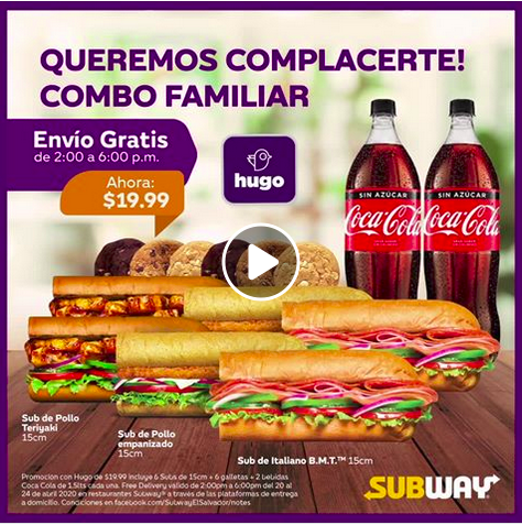 Oferta de Free Delivery (Entrega Gratis) aplica solamente en ordenes realizadas a través de la aplicación de HUGO desde las 2:00pm hasta las 6:00pm. Aplican cargos adicionales por servicio a domicilio en otros horarios. Promoción de $7.49 incluye 2 Subs de 15cm o Wraps a elegir entre los sabores Italiano B.M.T., Jamón, Pollo Empanizado, Pollo Teriyaki o Atún, 2 galletas y dos latas de gaseosa de 350ml. No se permiten sustituciones, ni convertir en 30cm o Ensalada. Sabores de las galletas y bebidas sujetos a disponibilidad. Costo adicional por otros acompañamientos y por Extras. Sólo se permite Carne Extra del mismo sabor al Sub comprado. Carne Extra no disponible en los Wraps.