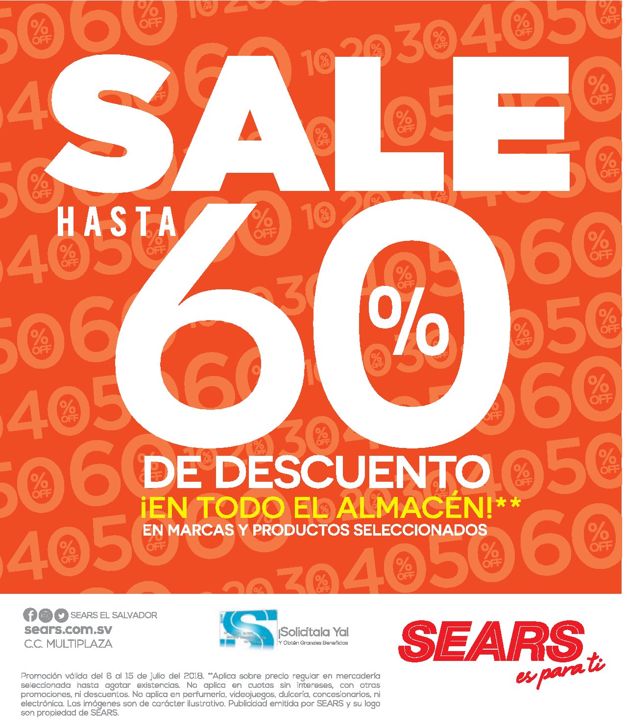 Llegó el SALE de medio año de ALMACENES SEARS El salvador. Ahora tus artículos favoritos con increíbles descuentos *Restricciones aplican. Válido del 6 al 9 de julio del 2018.