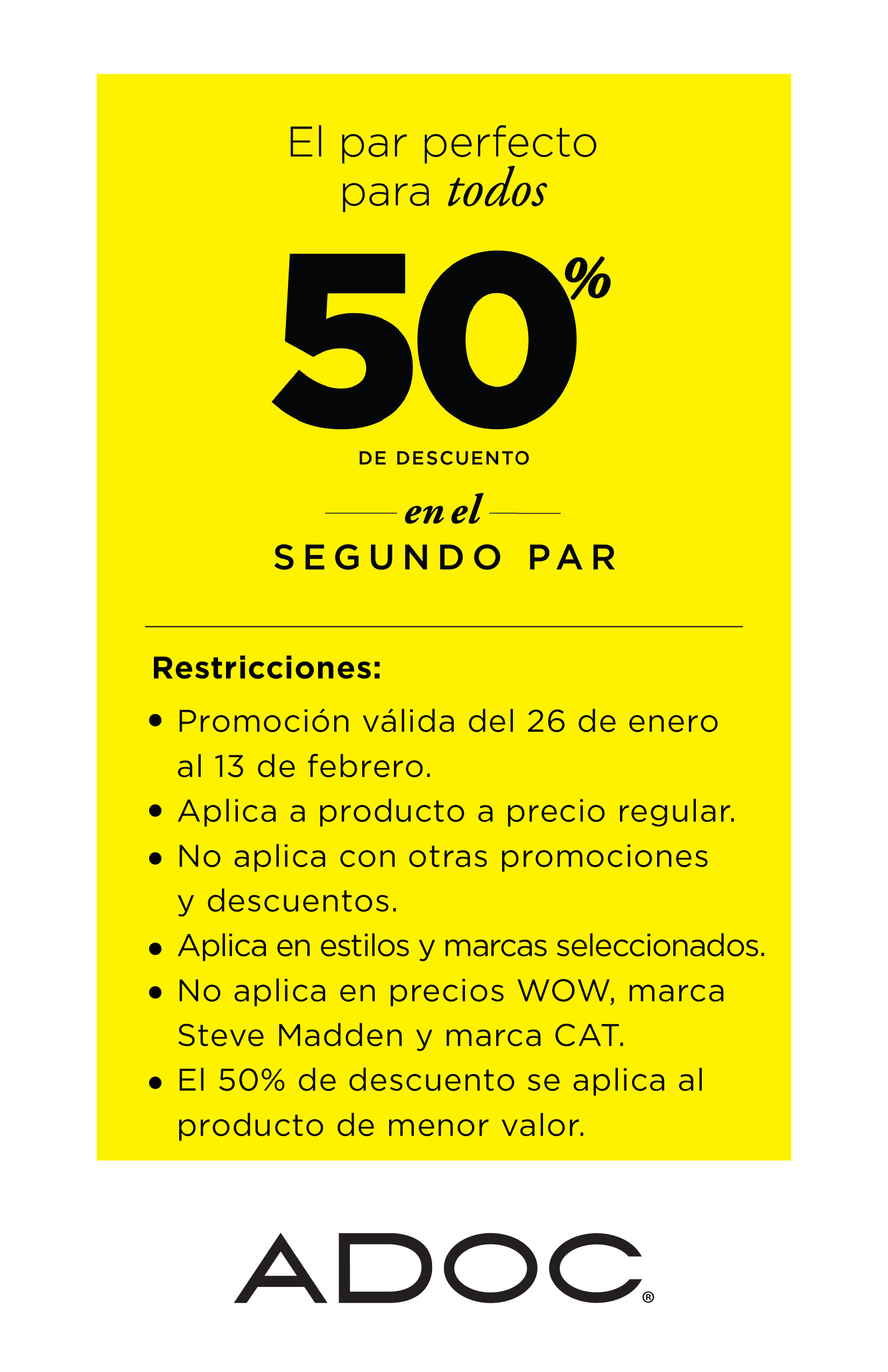 Aun estas a tiempo para comprar cazaldo nuevo en tiendas adoc el salvador porque la promocion llega hasta el Lunes 13 de febrero de 2017. Busca Tu segundo PAR de zapatos ADOC con 50% OFF en todo el pais. Recuerda revisar las siguientes condiciones de esta promocion y a estrena nueva zapatitos.