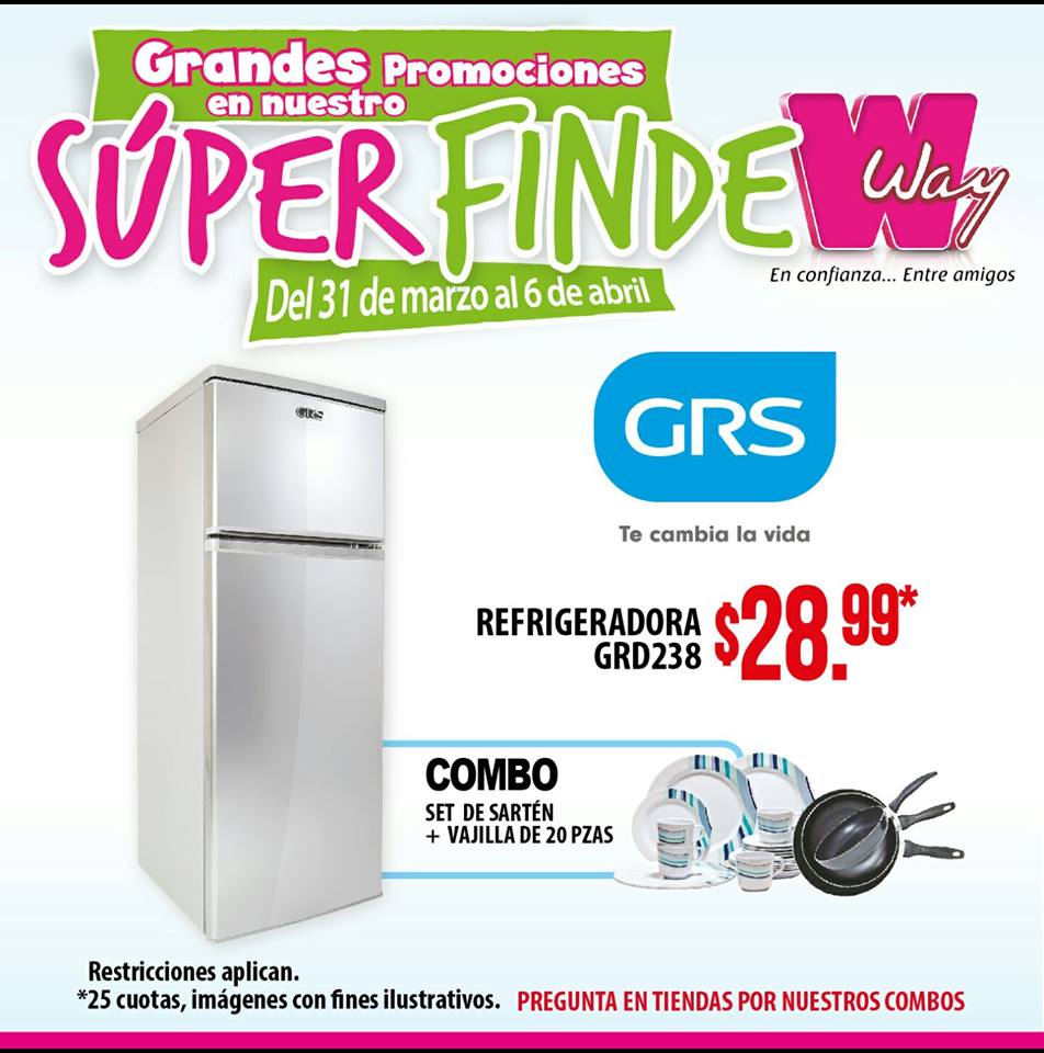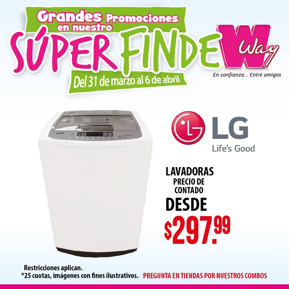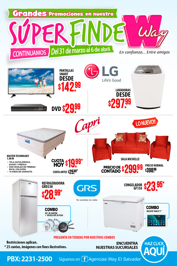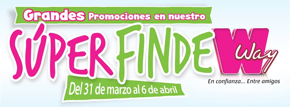 TODA la semana hasta el 6 de abril de 2017 Grandes promociones en artículos para el hogar, acércate a cualquiera de nuestras sucursales en todo el país y obten los mejores precios este fin de semana. Seguimos con las promociones en nuestro Súper Finde Way, acércate a tu Agencia de preferencia y pregunta por nuestras grandes promociones.