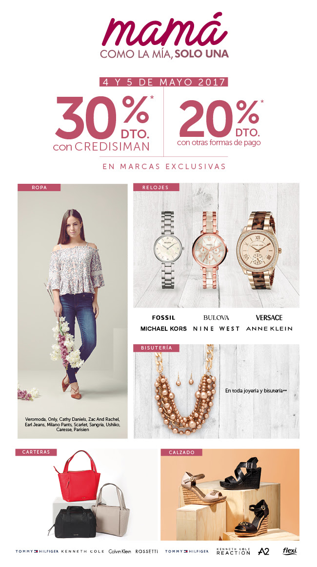 *Restricciones aplican. Descuento aplica en marcas y estilo seleccionados a precio regular. Válido únicamente 4 y 5 de mayo de 2017. No aplica con otras promociones o descuentos. No aplica en oro. Veromoda, ONLY Y Calzado Anne Klein disponibles en Metrocentro, Galerías y La Gran Vía. Carteras Calvin Klein disponibles en Galerías y La Gran Vía.