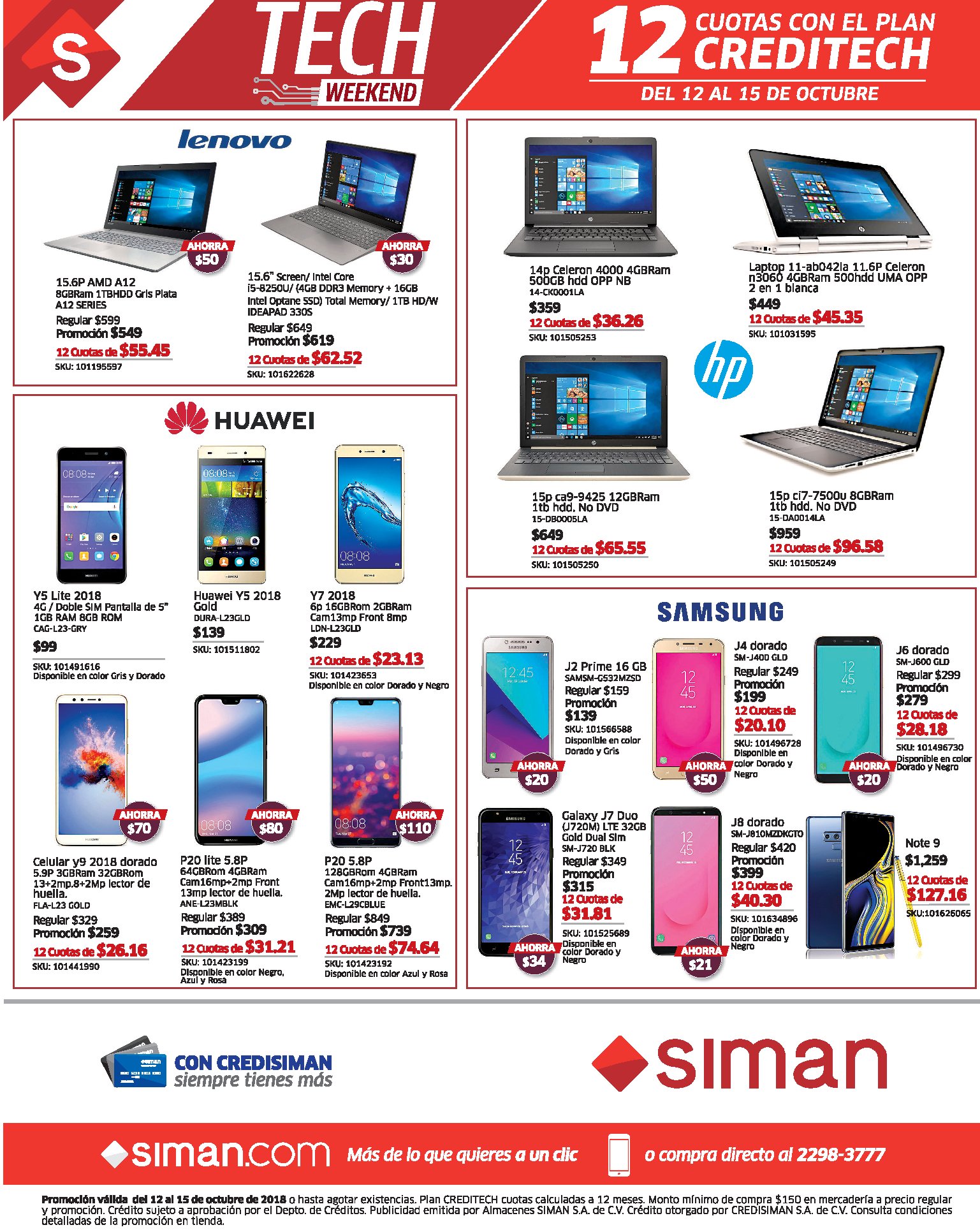 ¡Si eres amante de la tecnología esto es para ti! Llévate tu modelo de celular favorito a 12 cuotas plazo con nuestro Plan CREDITECH. ¿Qué esperas? *Promoción válida del 12 al 15 de octubre 2018 o hasta agotar existencias. Plan CREDITECH cuotas calculadas a 12 meses. Monto mínimo de compra $150 en mercadería a precio regular y promoción. Consulta condiciones detalladas de la promoción en tiendas.