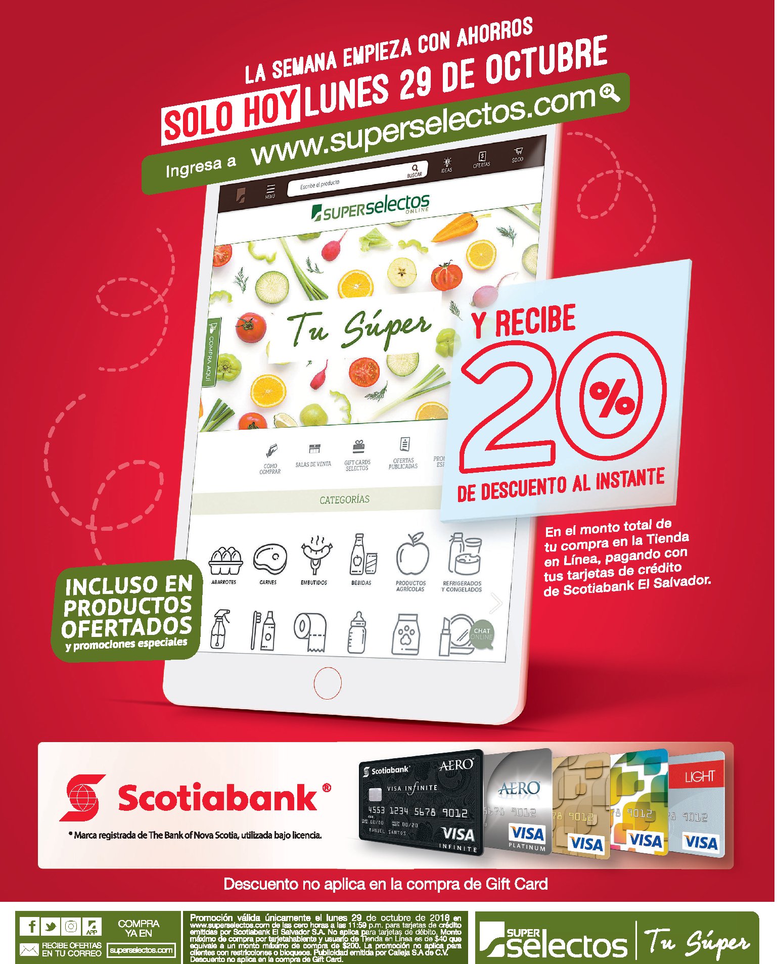 Inicia la semana compran ONLINE en super selectos, este lunes hay descuento adicional sobre todos los precios inclusive aquellos rebajados, ingresa a la tienda enlinea de superselectos el salvador y ahorra desde el primer dia de la semana gracias a scotiabank el salvador.