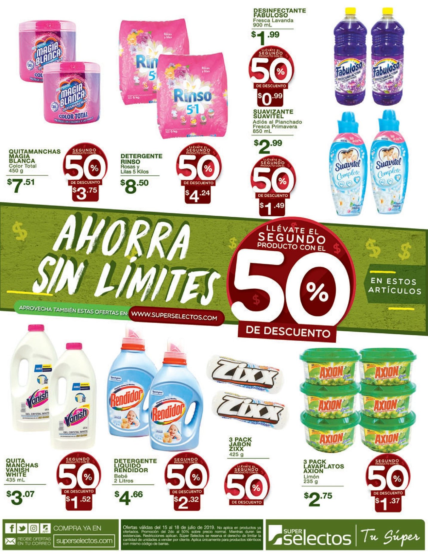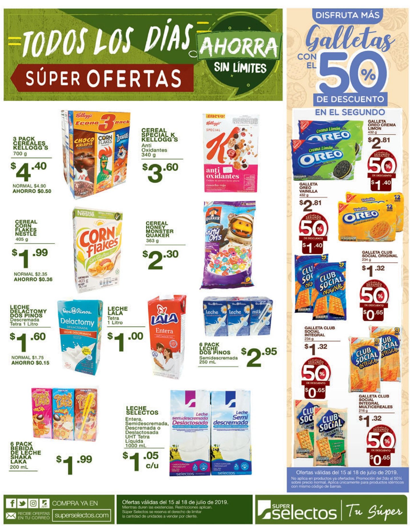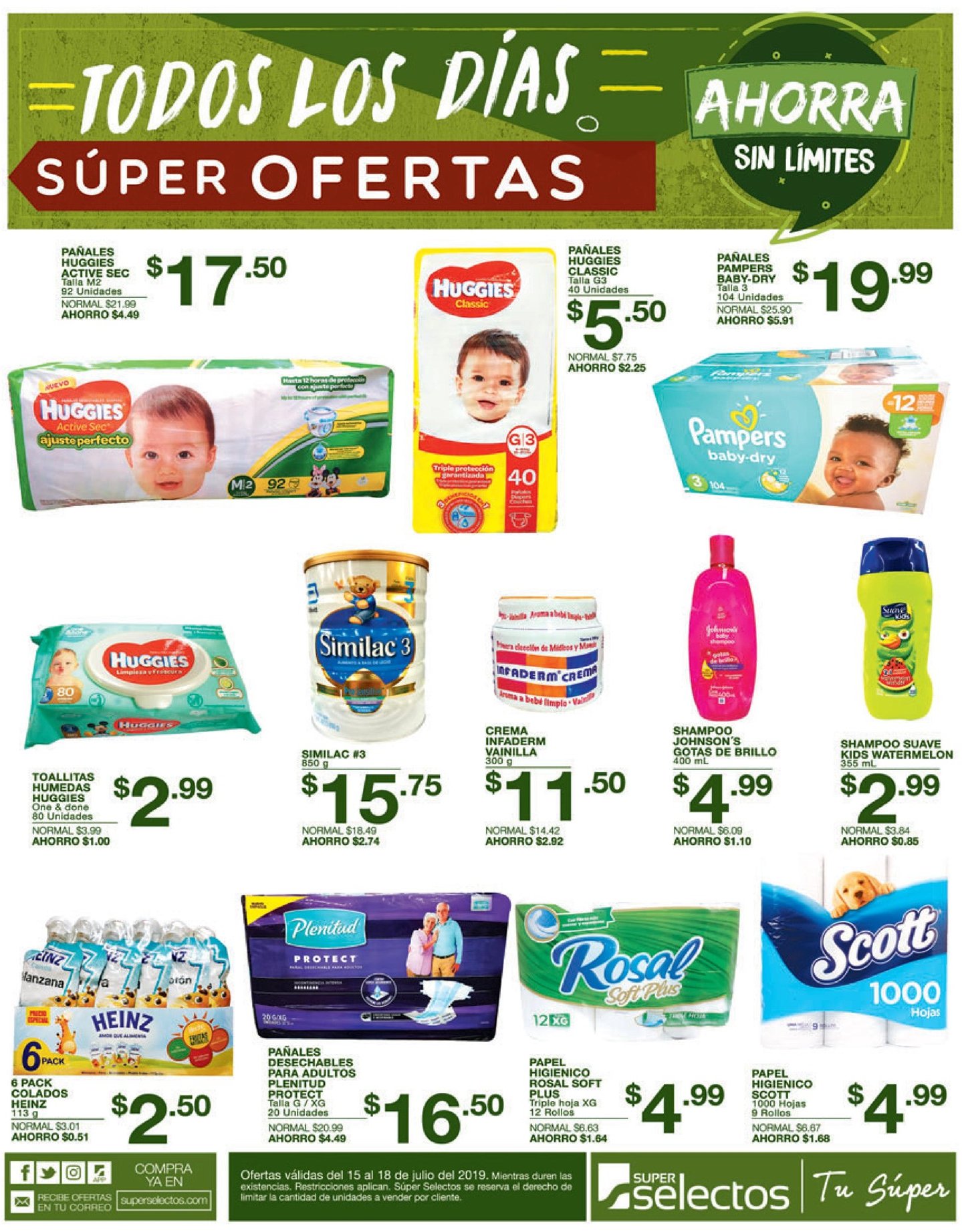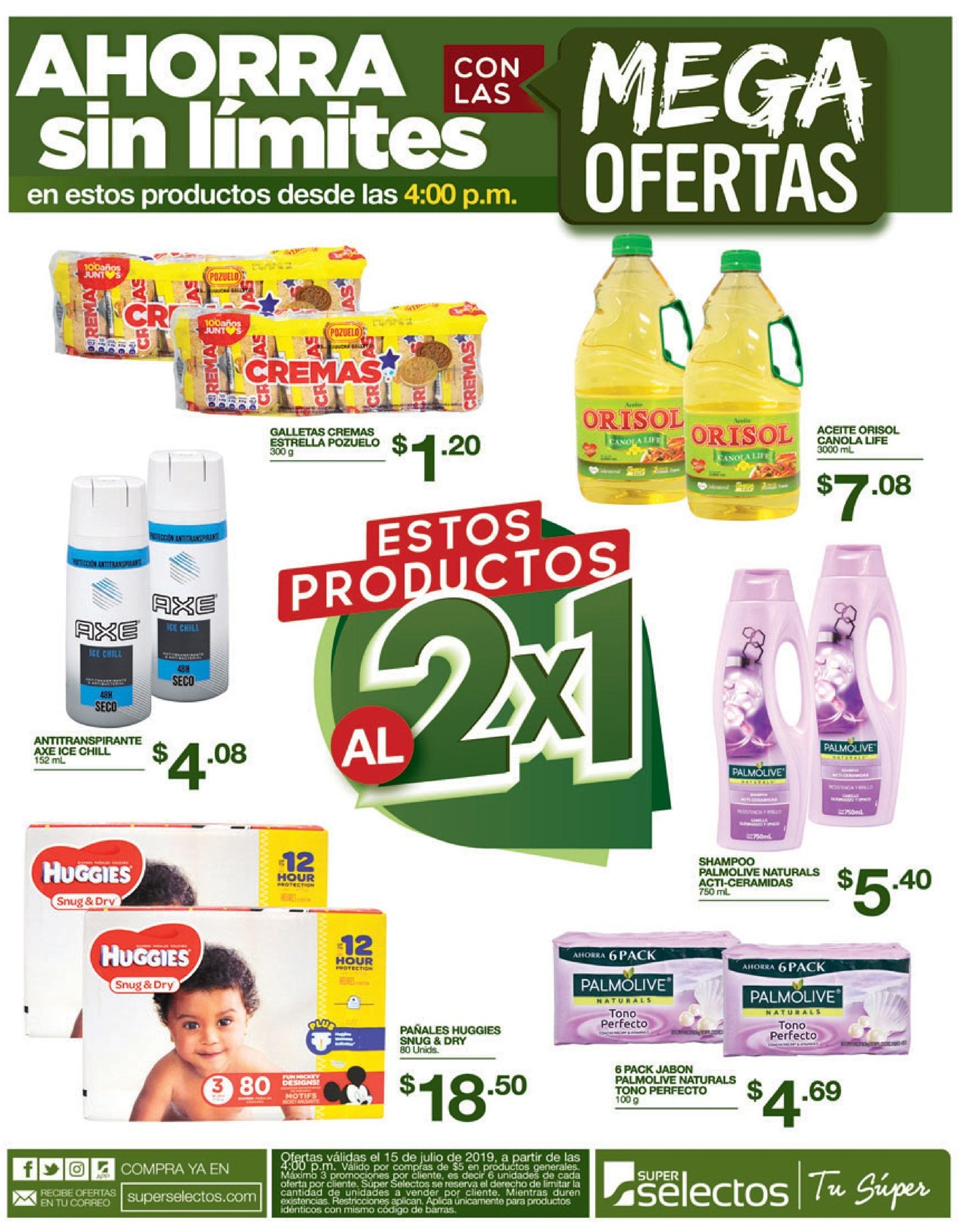 Ofertas válidas el 15 de julio de 2019, a partir de las 4:00 p.m. Válido por compras de $5 en productos generales. Máximo 3 promociones por cliente, es decir 6 unidades de cada oferta por cliente. Súper Selectos se reserva el derecho de limitar la cantidad de unidades a vender por cliente. Mientras duren existencias. Restricciones aplican. Aplica únicamente para productos idénticos con mismo código de barras.
