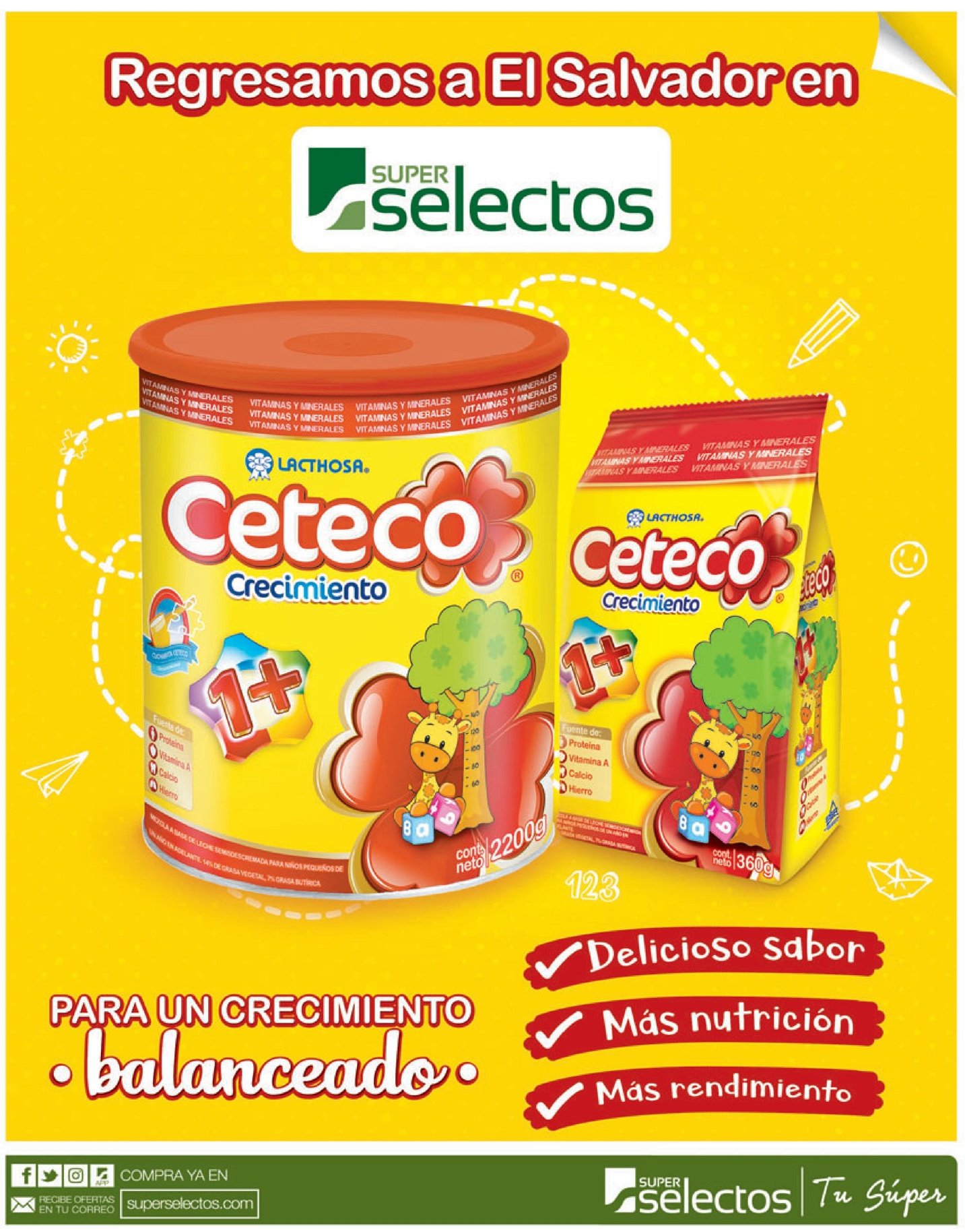 Ceteco regresa a El Salvador en Súper SelectosCeteco Crecimiento 1+ es un alimento especializado para bebés que estén por cumplir un año. Contiene vitaminas y minerales esenciales para fortalecer su sistema inmunológico y digestivo.Los productos que ingresaban a nuestra cadena de supermercados son las presentaciones de Ceteco Crecimiento 1+ de 360 g, 800 g, 1600 g y 2200 g en bolsa y lata. Encuéntralos en todos los Súper Selectos y
