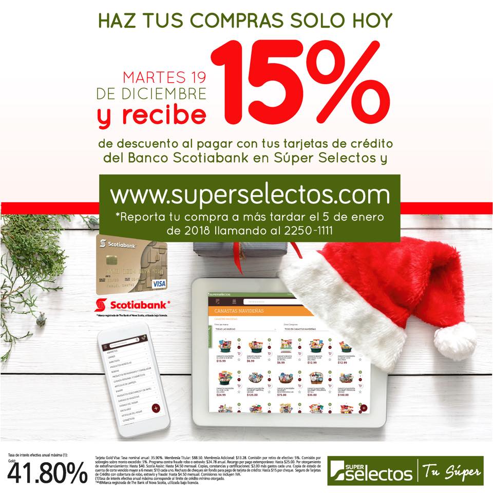 con tus tarjetas de crédito de Banco Scotiabank* *Para aplicar al descuento del 15% el cliente debe reportar su compra al 2250-1111 a más tardar el 5 de enero de 2018. Monto máximo de descuento por cliente $15.00 que equivale a un monto máximo de compra de $100.00. No aplica tarjeta de débito. El descuento será reflejado en el estado de cuenta a más tardar 30 días después de reportada la compra.