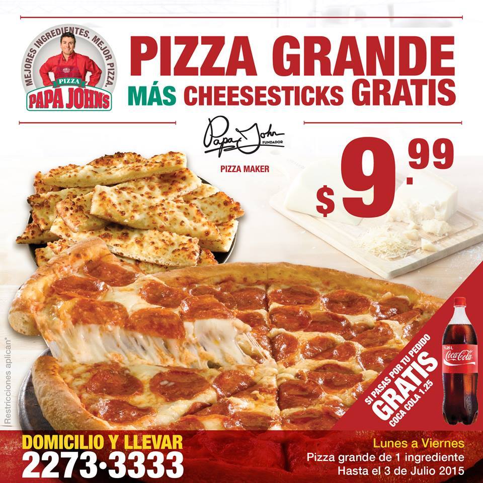 Pizza Grande mas cheesesticks GARTIS por 9.99 papa johns