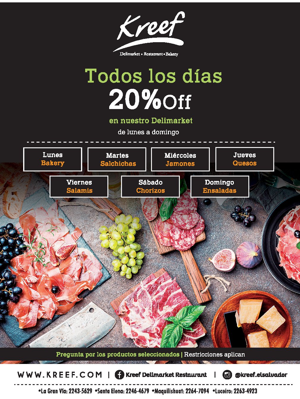 Todos los dias 20% OFF en tus compras DELIMARKET KREEF por admin · octubre 22, 2018 De lunes a domingo encontra en tu tiendas y restaurantes kreef descuentos en productos seleccionados. Lunes BAKERY, martes salchicas, miercoles Jamones, Jueves Quesos, Viernes salami, Sabado chorizos, Domingo ensaladas.
