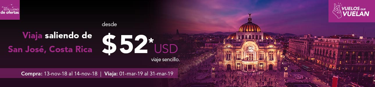 SJO Operado por Volaris Costa Rica. Precio disponible desde $52.00 USD. Tipo de cambio del BCCR a la fecha de compra. El precio puede variar por vuelo y la ocupación de vuelo. Compra del 13 al 14 de noviembre de 2018 y viaja del 1 de marzo de 2019 al 31 de marzo de 2019. Precio aplica solo ida saliendo desde el Aeropuerto Internacional Juan Santamaría e incluye impuestos. No incluye servicios adicionales al transporte aéreo. Consulta restricciones y condiciones en volaris.com. Precio disponible únicamente para compra en volaris.com.