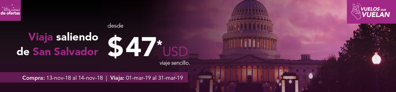 Operado por Volaris Costa Rica. Viaja saliendo de San Salvador hacia Ciudad de México o Cancún desde $99.00 USD. Viaja saliendo de San Salvador hacia Estados Unidos desde $180.00 USD. Viaja saliendo de San Salvador hacia San José Costa Rica o Guatemala desde $69.00 USD. El precio puede variar por vuelo y la ocupación de vuelo.Compra al 14 de noviembre de 2018. Para viajar en el periodo que comprende del 14 de noviembre al 30 de noviembre del 2018. Precio aplica solo ida saliendo desde el Aeropuerto Internacional Óscar Arnulfo Romero y Galdámez incluye impuestos. No incluye servicios adicionales al transporte aéreo. Consulta restricciones y condiciones en volaris.com. Precio disponible únicamente para compra en volaris.com.