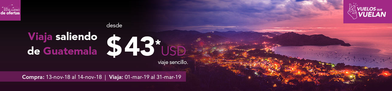 Operado por Volaris Costa Rica. Viaja saliendo de Guatemala hacia Ciudad de México o Cancún desde $99.00 USD. Viaja saliendo de Guatemala hacia Estados Unidos desde $180.00 USD. Viaja saliendo de Guatemala hacia San José Costa Rica o San Salvador desde $69.00 USD. El precio puede variar por vuelo y la ocupación de vuelo. Compra al 14 de noviembre de 2018. Para viajar en el periodo que comprende del 14 de noviembre al 30 de noviembre del 2018. Precio aplica solo ida saliendo desde el Aeropuerto Internacional La Aurora incluye impuestos. No incluye servicios adicionales al transporte aéreo. Consulta restricciones y condiciones en volaris.com. Precio disponible únicamente para compra en volaris.com.